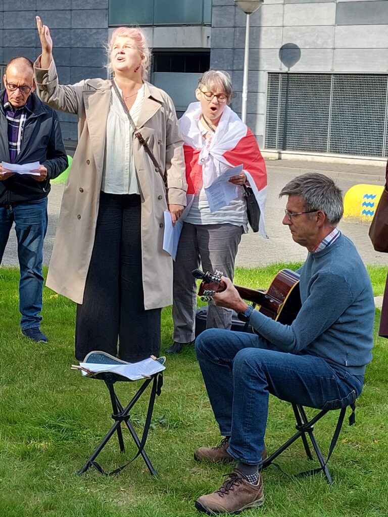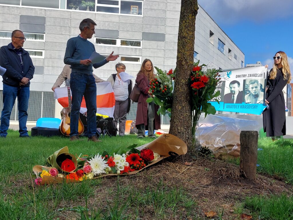 Voor de herdenking van 2025 verzamelden we ons met een groep mensen rondom de vierde boom. Helaas is één van de bomen er slecht aan toe en zal mogelijk vervangen moeten worden. Er was ruimte voork reflectie op de vier mannen die we herdenken, de recente vrijlatingen en de blijvende repressie in Belarus, met poëzie, samenzang en voordrachten. De kleindochter van Antatoly Krasovski begeleidde haar moeder voor het eerst in het leggen van bloemen bij de boom gewijd aan hun vader en grootvader.