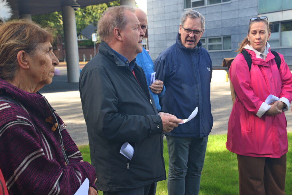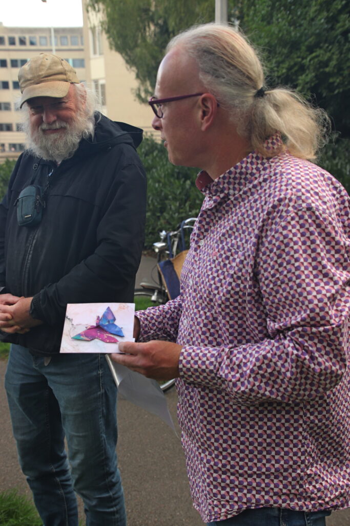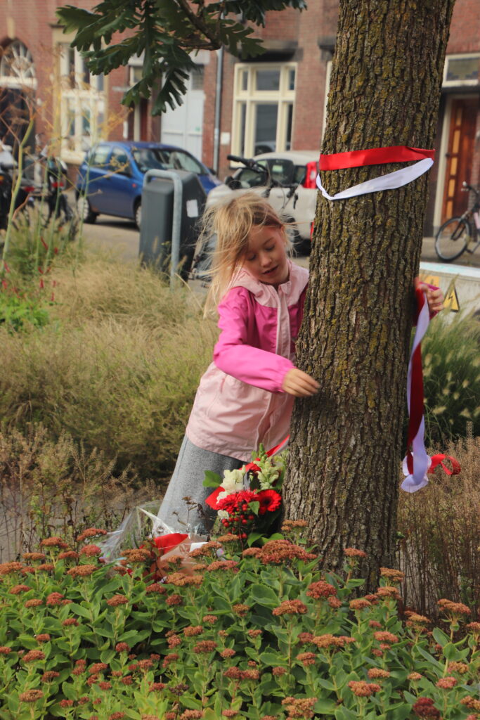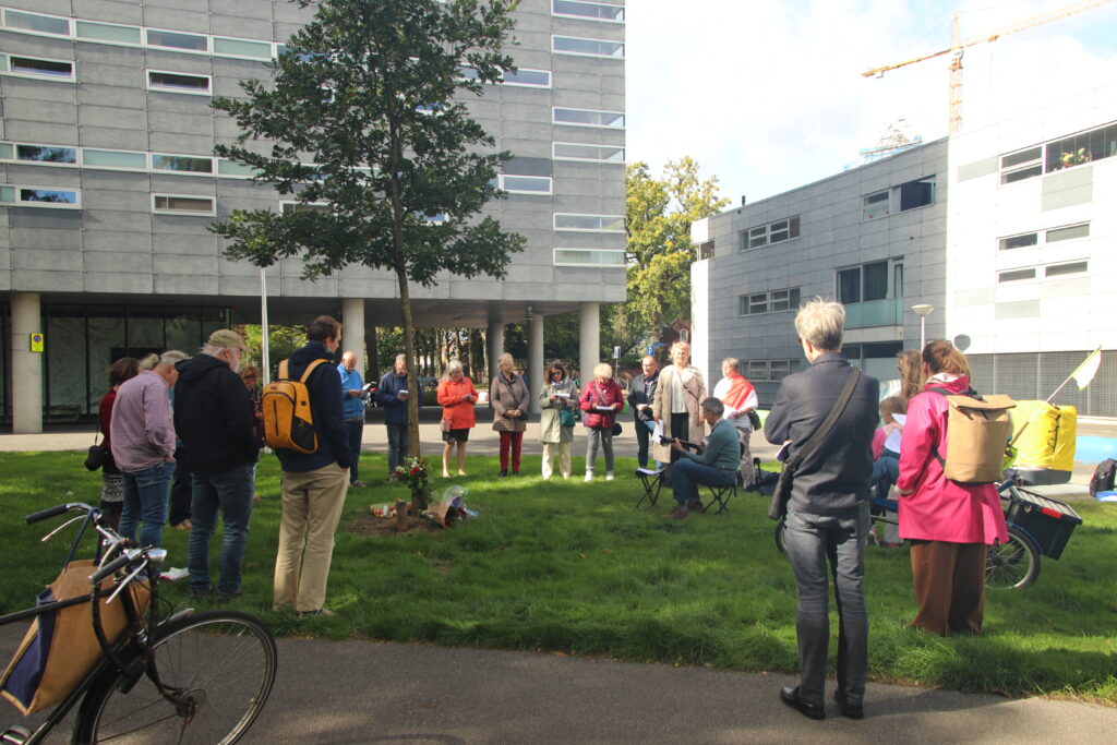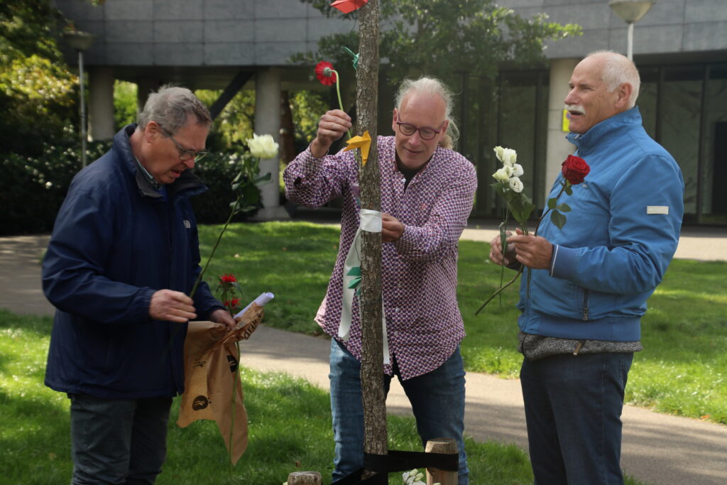 Op 16 september 2024 kwamen we wederom in een kleine informele sessie bijeen rondom de vierde boom. Na een korte inleiding en voorlezing van het gedicht “vier bomen” kreeg iedereen de kans kort indrukken, een verhaal, een gedicht of een lied te delen. Samen luisterden we naar en zongen het Belarusische “Aksamity letny wieczor” en Valeriya Krasovskaya sloot af met haar persoonlijke bespiegelingen over haar vader en ons samen zijn. Samen plaatsen we bloemen bij de bomen als afsluiting van de bijeenkomst.