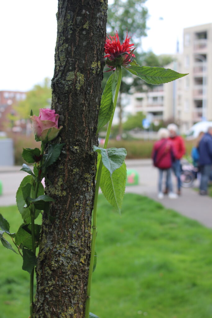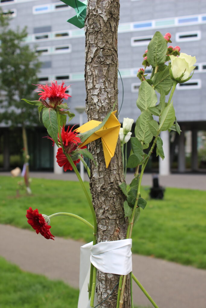 Ook vragen we iedereen om een bloem, eventueel met een kaartje en een boodschap, mee te brengen om na afloop neer te leggen bij een van de bomen.